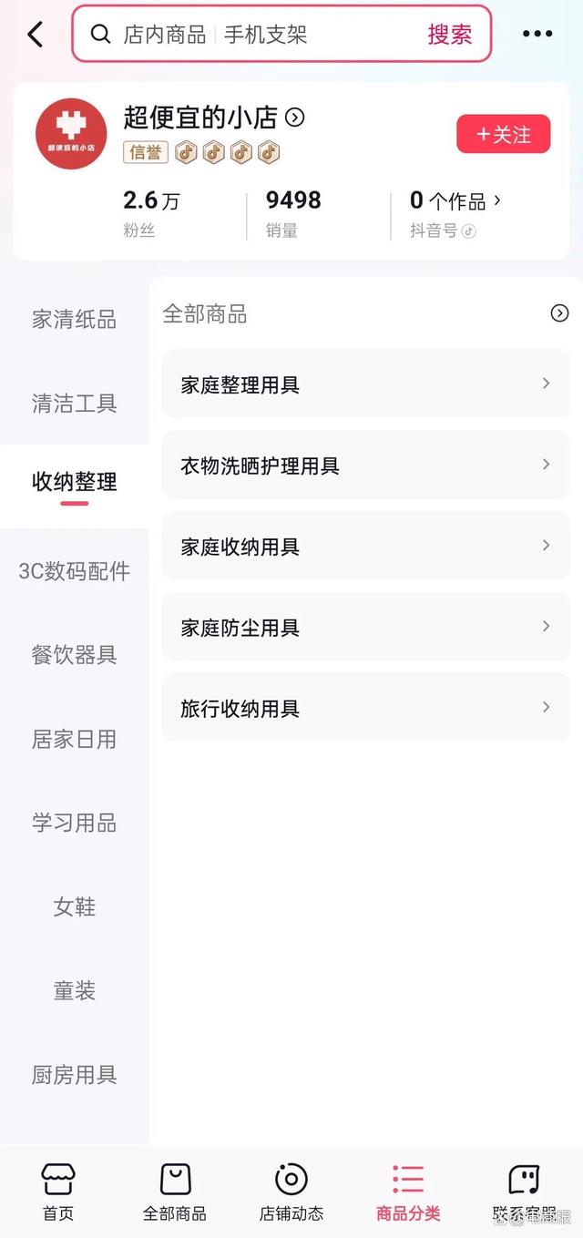 同时可以看到,店铺售卖的商品种类涵盖了多个品类,包括3C数码配件、餐饮器具、学习用品、居家用品、服装等等,部分商品大类之下还会再细分出小的类别。